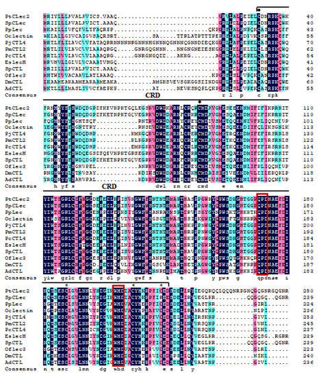 Multiple alignment of PtCLec2 with other arthropod C-type lectins. The CRD domain enclosed with bracket. The conserved amino acids are shaded in black, and the similar residues are indicated in blue or red. The four conserved cysteines are labeled with asterisks (*), and two additional cysteines are labeled with dark spots (•). The conserved Ca2+-binding site motifs (QPD and WHD) are marked by red boxes. The sequences include SpCLec (S. paramamosain, AGC96521.1), PpLec (P. plagipennis, ATU82908.1), Oclectin (O. cincta, ODM99338.1), PjCTL4 (P. japonicus, AHA85979.1), PmCTL2 (P. merguiensis, AGS42193.1), PcCTL4 (P. chinensis, ACJ06432.1), EsLecH (E. sinensis, APA32005.1), SpCTL (S. paramamosain, SAY41335.1), Oflec3 (O. furnacalis, AIR96004.1), DmCTL (D. magna, KZS16226.1), and AdCTL (A. darlingi, ETN63566.1).