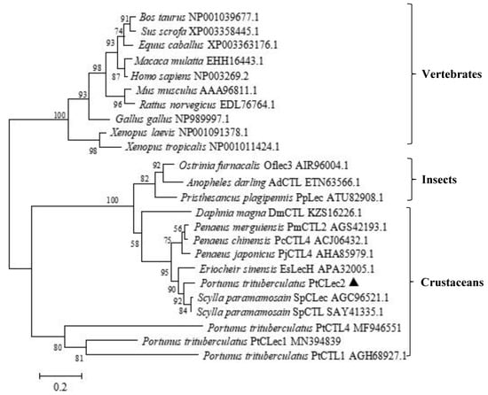 Neighbor-joining phylogenetic analysis based on amino acid sequences of CRDs from C-type lectins. Numbers in each branch indicated bootstrap values for 1000 replicates. PtCLec2 is marked with a triangle (▲).