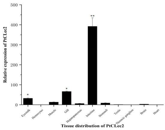 qRT-PCR was performed to detect the mRNA expression of PtCLec2 in 11 tissues of healthy crabs. PtCLec2 was highest expressed in intestine, which was 194.5-fold higher than that in hemocytes (p < 0.01). The mRNA expression levels of PtCLec2 in gill and eyestalk were also higher while relatively lower expression in muscle, stomach, hepatopancreas, brain, testis, heart, and thoracic ganglia (Figure 4).