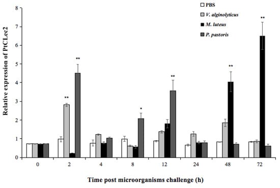 Temporal expression of PtCLec2 in hemocytes of crabs post-microorganism challenge. Error bars show the mean ± S.D. (n = 3). Asterisks indicate significant differences compared to the control group at the same sampling time (* p < 0.05, ** p < 0.01).