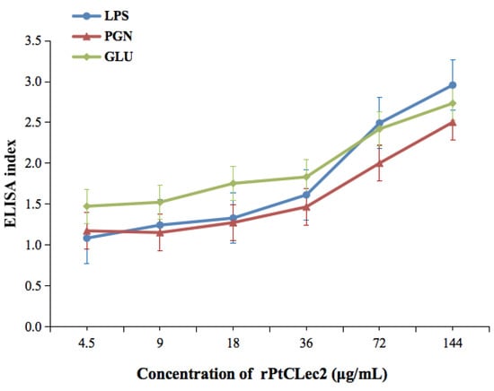 LPS, GLU, and PGN were used to test the binding of rPtCLec2 to microorganism components. As shown in Figure 7, the EI values of rPtCLec2 toward LPS, GLU, and PGN were above 1.0 at the minimum concentration of rPtClec2 (4.5 μg mL−1) and the binding of rPtCLec2 showed a dose-dependent trend. Compared with binding to LPS and GLU, rPtClec2 showed relatively weak affinity for PGN. The control protein rTrx had no PAMP-binding capacity (data not shown).