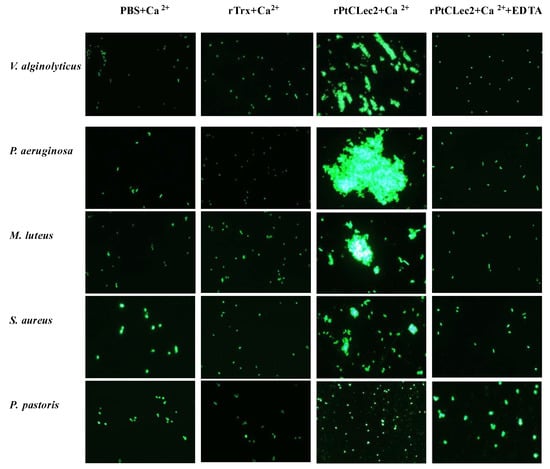 Five aforementioned microorganisms were used to test the agglutination ability of rPtCLec2 according to a previous study [30] with minor modifications. Microorganisms were grown to mid-logarithmic phase in the corresponding growth medium and collected by centrifugation at 10,000 rpm for 1 min. The microorganisms were washed with PBS, resuspended to 107 cells mL−1, and stained with FITC. The FITC-labeled microorganisms were washed with PBS until the supernatant is clear of obvious fluorescent material. A volume of 10 μL microbial suspension was mixed with 25 μL rPtCLec2 with the addition of CaCl2 (10 mmol L−1) or EDTA (10 mmol L−1). After rotation in the dark for 2 h, the mixture (5 μL) was observed under fluorescence microscopy. rTrx and PBS were served as a negative and blank control, respectively.