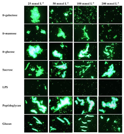 The microbial agglutination assay showed rPtCLec2 had obvious agglutination activity to the tested microorganisms except for fungi in the presence of Ca2+ (Figure 9). Moreover, rPtCLec2 had stronger agglutination ability to Gram-negative bacteria than to Gram-positive bacteria. The microbial agglutination of rPtCLec2 could completely disappear with incubation of Ca2+ and EDTA, indicating that this activity was Ca2+-dependent. To investigate carbohydrate specificity of PtCLec2, an agglutination inhibition assay was carried out (Figure 10). The agglutinating activity of rPtCLec2 against Gram-negative bacteria P. aeruginosa was inhibited with the increasing concentration of LPS, d-galactose, and d-mannose. However, this agglutination has no obvious change after the addition of sucrose, peptidoglycan, and glucan at the tested concentration.