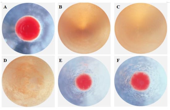 Agglutinating activity of rPtCLec2 to rabbit erythrocytes: (A) 1.0 mg mL−1 rTrx, (B) 1.0 mg mL−1 rPtCLec2, (C) 0.875 mg mL−1 rPtCLec2, (D) 0.75 mg mL−1 rPtCLec2, (E) 0.5 mg mL−1 rPtCLec2, and (F) 1.0 mg mL−1 rPtCLec2 and 10 mmol L−1 EDTA.