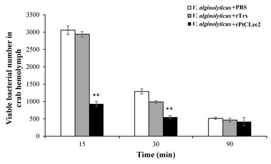 V. alginolyticus clearance enhanced by rPtCLec2. Crabs were challenged with rPtCLec2, rTrx, or PBS pre-coated V. alginolyticus. Hemolymph was collected at 15, 30, and 90 min after V. alginolyticus injection. The bacterial counts in 100 μL hemolymph were recorded, and the experiment was repeated three times. Significant differences compared with control are denoted with asterisks (** p < 0.01).