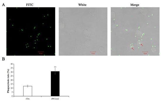 The hemocyte-mediated phagocytosis of V. alginolyticus was significantly enhanced by rPtCLec2 (Figure 13). After incubation with rPtCLec2, the phagocytized V. alginolyticus was detected in the cytoplasm of crab hemocytes. The phagocytic rate against V. alginolyticus in the rPtCLec2 group was 30.9%, which was much higher than that in the control group (12.5%).