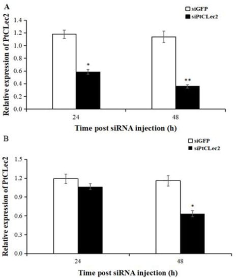 Relative expression levels of PtCLec2 in hemocytes (A) and intestine (B) at 24 and 48 h after injection with siRNA. Error bars represent the mean ± S.D. (n = 3). Significant differences compared with control are denoted with asterisks (* p < 0.05, ** p < 0.01).