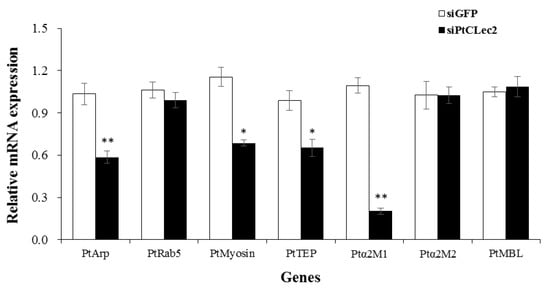 Expression levels of phagocytosis genes and complement-like genes after PtCLec2 RNAi. The control group was injected with siGFP. Error bars represent the mean ± S.D. (n = 3). Significant differences compared with control are denoted with asterisks (* p < 0.05, ** p < 0.01).