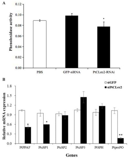 Phenoloxidase activity (A) and expression of proPO system genes (B) after PtCLec2 RNAi. Error bars show the mean ± S.D. (n = 3). Significant differences compared with control are denoted with asterisks (* p < 0.05, ** p < 0.01).