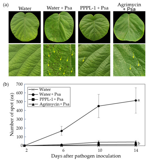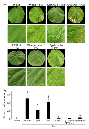 Control efficacy of PPPL-1 phage treatment against bacterial canker caused by Pseudomonas syringae pv. actinidiae (Psa) KBE9 and SYS1 mixture in planta. (a) The kiwifruit leaves 10 days after pathogen inoculation (dai) with phages or antibiotic pesticide. Bottom figures are enlarged photographs of top leaves. The yellow arrows indicate symptomatic spots. The sterilized water was used for dilution of phages and bacteria. Water, PPPL-1 (108 pfu/mL), or Agrimycin™ (0.4 g/L) was applied 2 h before infection with Psa (108 cfu/mL). (b) The mean of numbers of symptomatic spots on the treated leaves (n = 12). The error bars indicate the standard error, and the different alphabets in the next of lines indicate the different groups based on significant differences at p < 0.05 by Duncan’s multiple range test at 14 dai.