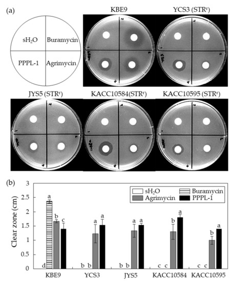 Streptomycin-based products are mainly used for control of Psa [26,28]. However, many studies have reported the emergence of streptomycin-resistant Psa isolates [27,29,40]. Four streptomycin-resistant Psa strains isolated from South Korea (YCS3, JYS5, KACC10584, and KACC10595) were used to examine the antibacterial effects of PPPL-1 against them in vitro. For this assay, BuramycinTM containing a streptomycin as an active compound and Agrimycin™ containing both streptomycin and oxytetracycline as active compounds were used as controls. BuramycinTM did not suppress bacterial growth of streptomycin-resistant Psa isolates at all, while it caused the formation of clear zone against only Psa strain KBE9, a streptomycin-sensitive isolate (Figure 4a,b). In contrast, both Agrimycin™ and PPPL-1 phage formed clear zones against all Psa strains, and their antibacterial activities were statistically very similar at p < 0.05, although the sizes of clear zones slightly varied among Psa isolates. These results indicate that PPPL-1 phage could be used to control streptomycin-resistant Psa isolates like antibiotics products.