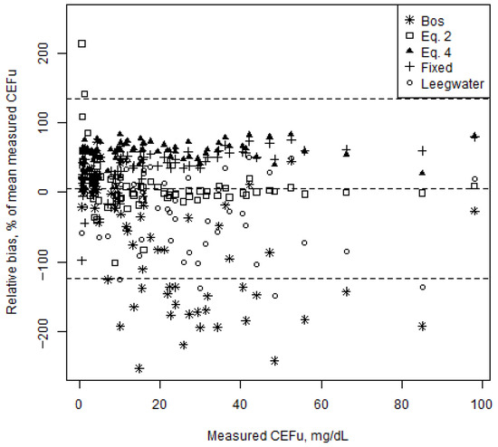 Agreement between the measured CEFu and CEFu predicted with each of these five methods was assessed by calculating bias (CEFu measured—CEFu predicted), relative bias (percent of mean CEFu measured) and relative root mean squared error (RMSE, percent of mean CEFu measured). Additionally, agreement was graphically assessed in a Bland–Altman plot [38]. The mean relative bias, and upper and lower limits of agreement are shown.