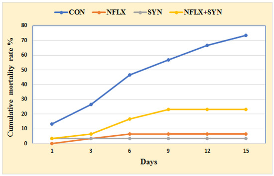 Figure 1 shows the impact of dietary additions of NFLX and SYN on Nile tilapia resistance to P. aeruginosa challenge in terms of cumulative mortality rate (CMR). The CMR percentage was higher in the SYN group, where the fish were fed an SYN-supplemented diet (3.33%), followed by the NFLX group fed with NFLX-supplemented diet (6.66%), and then the NFLX+SYN group fed with NFLX and SYN in the diet (23.33%). The CMR of the control group was 73.33%.