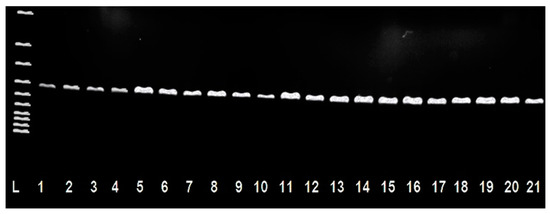 Identification of isolates of Staphylococcus spp. from sheep’s milk and cheese using the PCR method (420 bp). L: 100 bp ladder; Line 1: reference strain CCM 4223 S. aureus; Lines 2–21: isolates Staphylococcus spp.