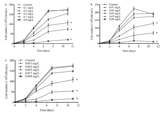 In the process of the experiment, a 3 mL algae culture medium was extracted from each Erlenmeyer flask to measure oxidative stress biomarkers at 11 days. The samples needed to be pretreated before the measurement of oxidative stress biomarkers, and the culture medium was centrifuged at 4000 rpm for 10 min. The supernatant was discarded. The cell pellet was resuspended in 1 mL of normal saline to wash, centrifuged again at 1000 rpm for 10 min, and the supernatant was discarded. The wash operation was repeated three times. A 2 mL volume of normal saline was added to the cell pellet then mixed well and homogenized manually, 1 min at a time at 30 s intervals, and repeated 6–8 times. Oxidative stress biomarkers were measured using a Tecan Infinite® 200 Pro Multifunction microplate reader (Tecan Austria GmbH, Grödig, Austria). Measurement of oxidative stress biomarkers was strictly performed according to the manufacturer’s instructions.