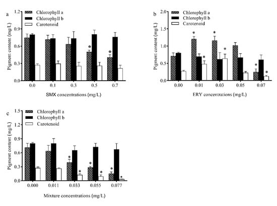 Effects of (a) SMX, (b) ERY, and (c) their mixture on the total chlorophyll and carotenoid contents of R. subcapitata. Data are presented as mean values ± standard deviation (n = 3). The asterisk (*) indicates a significant difference (p < 0.05) between control and treatments.