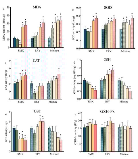 Contents of (a) malondialdehyde (MDA) and activities of (b) superoxide dismutase (SOD), (c) catalase (CAT), (d) glutathione (GSH), (e) glutathione S-transferase (GST), and (f) glutathione peroxidase (GSH-Px) in R. subcapitata after 11 days exposure to SMX, ERY, and their mixture. SMX (0, 0.1, 0.3, 0.5, and 0.7 mg/L), ERY (0, 0.01, 0.03, 0.05, and 0.07 mg/L), and their mixture (0, 0.011, 0.033, 0.055 and 0.077 mg/L in a ratio of SMX/ERY = 10:1). Data are presented as mean values ± standard deviation (n = 3). The asterisk (*) indicates a significant difference (p < 0.05) between control and treatments.