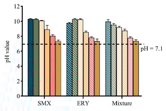 The pH value of R. subcapitata after 11 days exposure to SMX, ERY, and their mixture. SMX (0, 0.1, 0.3, 0.5, 0.7 and 0.9 mg/L), ERY (0, 0.01, 0.03, 0.05, 0.07, and 0.09 mg/L), and their mixture (0, 0.011, 0.033, 0.055, 0.077 and 0.099 mg/L). Data are presented as mean values ± standard deviation (n = 3).