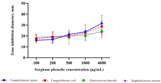 The antimicrobial activities of the sorghum phenolic extract were determined by a well diffusion assay [49]. Sixteen mm diameter wells were punched into MH agar (Becton Dickinson) and a small amount (approx. 30 µL) of melted MH agar was used to seal the bottom of the wells. A cotton swab was used to inoculate bacterial inoculum of the bacterial species to be tested onto MH agar with wells to obtain a lawn of growth. The wells were then filled with 100 µL of sorghum phenolic extract at concentrations of 0 (control), 100, 200, 500, 1000, or 4000 µg/mL with LB broth. Seventy percent ethanol was used to dissolve the sorghum phenolic extract and was added to wells as negative controls. The plates were incubated at 37 °C for 24 h aerobically or under microaerophilic conditions (for Campylobacter spp.). The diameter of the inhibitory zone was recorded.