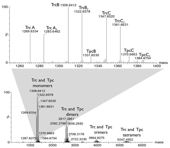 ESMS analysis of the cyclodecapeptides in the Trc mix. The mass spectra were generated with the MaxEnt 3 algorithm in MassLynx 4.01. The top spectrum shows the monomers in the Trc mix and the bottom spectrum shows the homo- and hetero-oligomers that were detected.