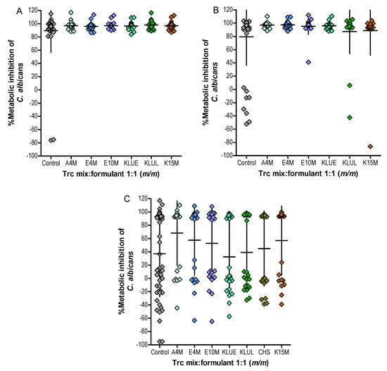 Metabolic inhibition of C. albicans cultures treated by formulated Trc mix at 50 µg/mL (A), 25 µg/mL (B) and 12.5 µg/mL (C). Each data point represents one treated culture. The mean % metabolic inhibition, calculated in terms of growth controls, is shown for each condition with standard deviation (SD).