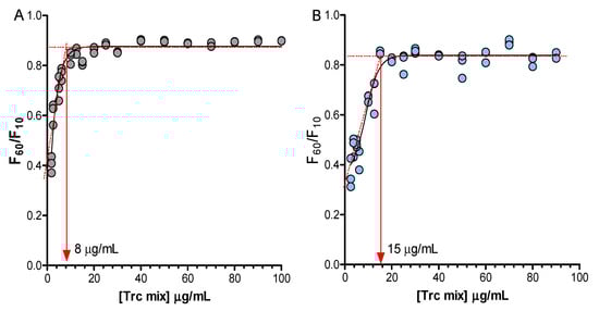 Monitoring the influence of the formulation on the oligomerisation concentration of the cyclodecapeptides in the Trc mix. Control (A); Trc mix: E4M (1:4) (B). Fluorescence excitation and emission of the Trc mix (1.25–100 µg/mL) were at 280 and 348 nm, respectively. Three repeats of each preparation are shown via scatter dot plots. Continual readings were taken for the first 60 min with F60/F10 (the reading taken at 60 min/reading taken at 10 min). A sigmoidal curve with a variable slope was fitted to each of the data sets (R2 > 0.99) and the intercept between the slope and the plateau was taken as the critical oligomerisation concentration.