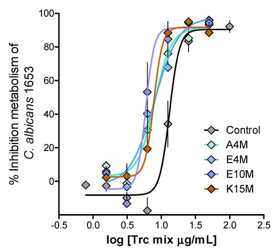 KLUE and KLUL had a more similar Trp fluorescence stabilisation over time than A4M, E4M, E10M and K15M, indicating similar structures. However, the latter four exhibited similar or better activity than the control preparation, and thus were selected for further investigation (Table 2, Figure 3). In subsequent studies, we considered the formulations of the 50 g/mL Trc mix with 50 µg/mL, 100 µg/mL and 200 µg/mL of A4M, E4M, E10M and K15M to yield formulation ratios of 1:1, 1:2 and 1:4, respectively. The formulations were incubated for 1 h (assumed as fresh) and 20 h (matured formulation) at ambient temperature (22 ± 2 °C). To fully assess these formulations, full dose-response assays were performed against C. albicans, as the high formulant concentration may lead to the masking of groups in the peptide structure that are necessary for recognising the target cells.