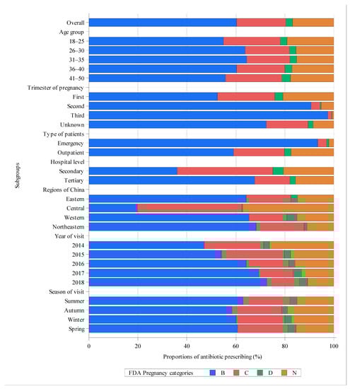 Proportions of antibiotics of FDA pregnancy categories within different subgroups. Category N is not a FDA pregnancy category. In this study, category N referred to antibiotics that had not been assigned any FDA category.