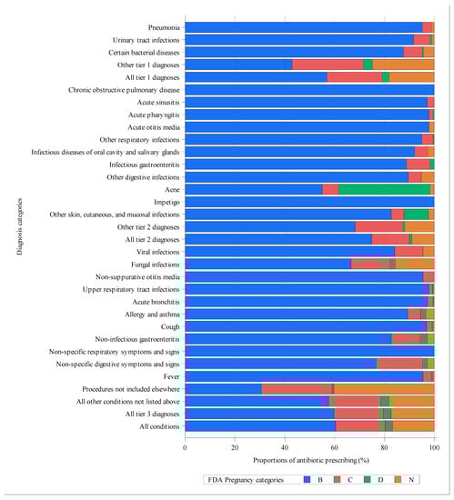 Proportions of antibiotics of FDA pregnancy categories within different diagnosis categories. Category N is not a FDA pregnancy category. In this study, category N referred to antibiotics that had not been assigned any FDA category.