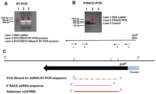 Detection of antisense yycF RNA. (A) Total RNA samples were isolated from S. aureus to detect ASyycF RNA transcription by first cDNA strand synthesis and RT-PCR (red arrows). (B) Detection of the 5′ terminus of the ASyycF transcription by 5′ RACE (red arrows): (a) gene-specific outer primer; (b) gene-specific inner primer; (c) and (d) are 5′ RACE outer and inner primers, respectively. (C) Schematic of ASyycF showing that transcription starts within the 5′ terminus in the yycF open reading frame (ORF). The full length for ASyycF RNA is approximately 400 bp.