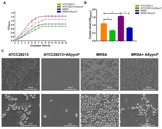 ASyycF modulated the bacterial growth and biofilm organization. (A) The growth curves for the Staphylococcus aureus. (B) Biomass was quantified by crystal violet staining. Optical densities at 600 nm were measured (n = 10, * p < 0.05). (C) SEM images of S. aureus ATCC29213, and methicillin-resistant Staphylococcus aureus (MRSA) strains after ASyycF overexpression.
