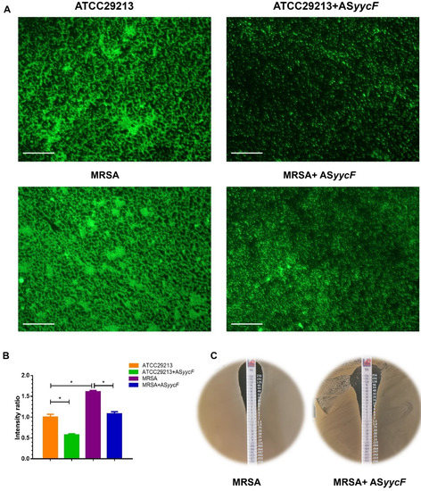 Effect of biofilm formation on antibiotics sensitivity. (A) Intensity of fluorescence for S. aureus ATCC29213, and MRSA strains after ASyycF overexpression (scale bar = 100 μm). (B) Intensity of fluorescence comparisons and the intensities of S. aureus ATCC29213 were measured as reference (n = 10, * p < 0.05). (C) E-test for the sensitivity of MRSA to vancomycin.