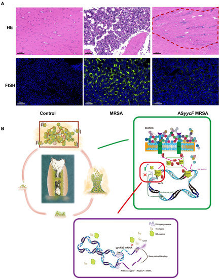 ASyycF inhibited MRSA invasion in rat tibial infective model. (A) HE staining for histological evaluation (upper lane); the fluorescent labeled peptide nucleic acid in situ hybridization probing for S. aureus (lower lane). (B) Working model.