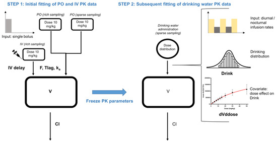 After initial estimation of the fixed and random-effect parameters from the IV and PO (rich and sparse) datasets, their typical values and variances were subsequently fixed. Thereafter, the drinking water PK data was included in the model. Essentially, group administration in drinking water is comparable to a prolonged monotonous oral administration (with varying diurnal and nocturnal rates) where chickens self-medicate depending on their drinking behaviour. As a consequence, three model improvements that are specific to the PK of group administration via the drinking water of animals were successively implemented.