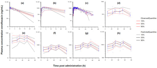 Stratified visual predictive check (VPC) of the different treatment groups ((a)—IV, (b)—PO richly sampled, (c)—PO sparsely sampled, (d)—drinking water administration 2.5 mg/kg, (e)—drinking water administration 5 mg/kg, (f)—drinking water administration 10 mg/kg, (g)—drinking water administration 15 mg/kg, and (h)—drinking water administration 20 mg/kg) with 200 replicates of each animal. Approximately 20% of the data should fall outside the plotted quantiles. Red lines: observed quantiles; black lines: predicted quantiles; blue circles: observed data.