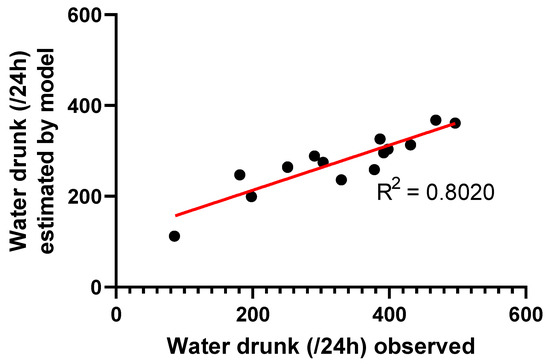 Correlation between the observed water consumption and the estimated water uptake by the model for 15 animals. The observed water drunk over 24 h was determined by adding the estimated proportion of nocturnal drinking (10.5%) to the water uptake evaluated during the photoperiod. Coefficient of determination (R2) = 0.8020.