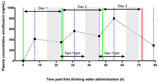 The green lines correspond with the time when enrofloxacin was introduced in the drinking water (9 a.m.) and kept for 24 h. This was done for three consecutive days. The red line indicates the cessation of enrofloxacin administration. The blue dotted lines relate to the six different sample points (7, 23, 31, 46, 55 and 79 h post administration). The grey areas indicate the periods that the light in the stable was turned off (scotoperiod, 11 p.m. to 7 a.m.), and the white areas correspond to the photoperiod. The black dotted line is an example of a PK profile of a representative broiler dosed at 10 mg/kg/24 h.