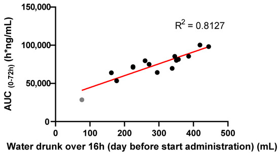 Secondly, there was evidence of variability in water uptake between the different birds. Indeed, there was a high correlation (R2 = 0.813, Figure 6) between the amount of water drunk by 15 filmed individual broiler chickens on the day before dosing (photoperiod) and their subsequent corresponding AUC (0–72 h) after administration of 20 mg/kg/24 h enrofloxacin (calculated by non-compartmental analysis). Note the one outlier on the left (grey dot) who drank very little, which is examined further in the discussion.