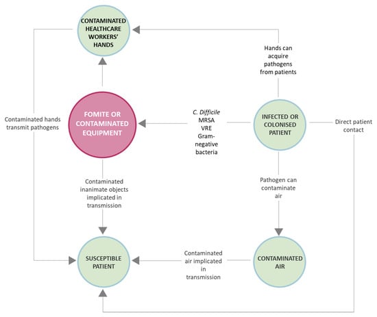 - Duckro, A.N.; Blom, D.W.; Lyle, E.A.; Weinstein, R.A.; Hayden, M.K. Transfer of vancomycin-resistant enterococci via health care worker hands. Arch. Intern. Med. 2005, 165, 302–307. [Google Scholar] [CrossRef]