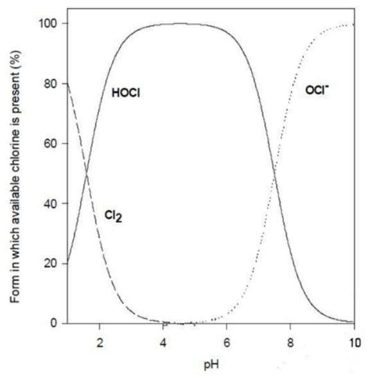 - Fukuzaki, S. Mechanisms of Actions of Sodium Hypochlorite in Cleaning and Disinfection Processes. Biocontrol Sci. 2006, 11, 147–157. [Google Scholar] [CrossRef]