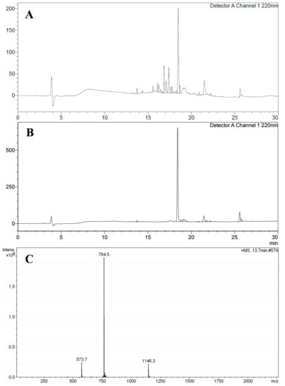 Ctx(Ile21)-Ha AMP was synthesized successfully by SPPS methodology. In the initial analysis, 590 mg of crude mass of AMP was obtained, which was subsequently purified. The purification yield was 20% with a total pure mass of 120 mg. The characterization analysis was carried out by HPLC and Mass Spectrometry, confirmed the obtaining of Ctx(Ile21)-Ha AMP (MW = 2289.72 g mol−1), shown in Figure 1.