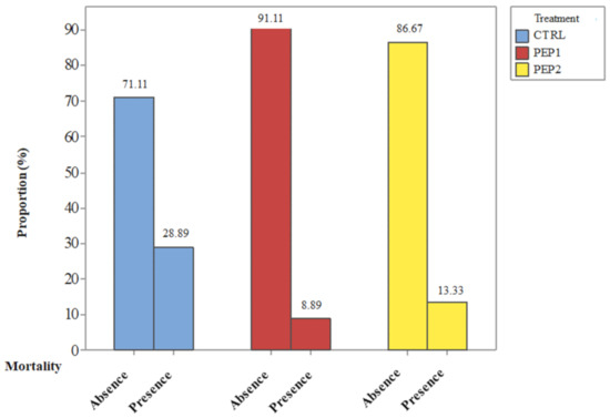 In this experiment there was no reduction in mortality when the peptide concentration was increased. Therefore, it is not necessary to test the statistical difference in mortality risk between these two doses. Moreover, a higher protection (lower mortality) was obtained with fewer resources (peptide mass), which is important in an industrial approach. That is, due to the results, the reduction in mortality does not improve due to the increase in concentration. However, in the best of cases, it remains the same. Furthermore, it is highlighted that there is statistical evidence that PEP1 treatment reduces total mortality, and not only due to S. Enteritidis infection. They can be used to establish a metric that quantifies the protection acquired by chicks, because they were also subjected to a treatment with peptides (PEP1 or PEP2). In addition, this can be due to the nature of the action of antimicrobial peptides, which is to protect the chicks against S. Enteritidis (Figure 4).