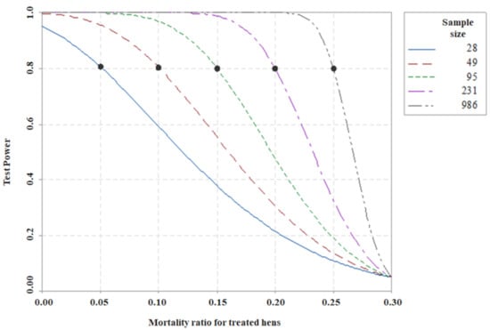 When assessing the sufficiency of the sample size, analysis with the Power Test can be included, which corresponds to the sensitivity of the test to reject the null hypothesis unequivocally, which can further improve test performance [24]. For this reason, a simulation was developed for different mortality rates lower than those obtained in the control treatment, according to the alternative hypothesis. The simulation for the sample size calculations was based on the estimates obtained, with a significance level of 5% and a power test of 80%, considered by Cohen [25] as acceptable. In Figure 5, the minimum number of sample units per treatment (for example, number of chicks used) is shown for the test to detect the reduction in mortality for proportions of 25 to 5%.