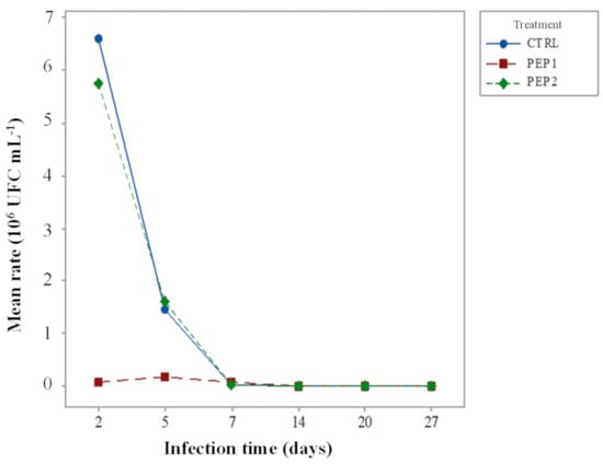 This result shows that there is no evidence of an interaction between treatment and age; that is, the treatment showing the best performance is still PEP1, especially on the second day of infection, and after that this treatment alone, does not differ significantly from the others, as shown in Figure 6.