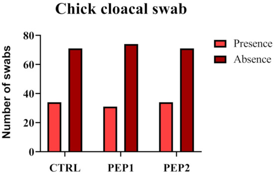Results of the follow-up of the infection with the swab method of the S. Enteritidis inoculum (Figure 7) at a concentration of 109 CFU mL−1, were subjected to the Chi-square test (p > 0.05), where the p-value found was 0.88. This result indicates that there is no evidence that the proportion of presence or absence is different between treatments. Therefore, based on this sample, it cannot be said that the treatment influences the absence or presence of the inoculum.