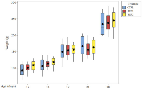 For the chick cloacal swab, 15 chicks were selected for each group. A collection of the fecal excretion was performed two times each week. The collected samples were incubated in 3 mL of SB and Novobiocin (Nov) at 37 °C for 24 h, to later be seeded in BG Nal/Spec and incubated again. This procedure was repeated throughout the experiment. The results were expressed as presence/absence of S. Enteritidis, depending on their being positive or negative for the pathogen, respectively [21,22]. In addition, chicks were weighed alive from 12 days of age until the end of the experiment. For the microbiological analyses, five chicks were used for each treatment for the day of the analyses (total of 30 chicks per treatment). Likewise, the chicks were weighed in triplicate for each treatment.