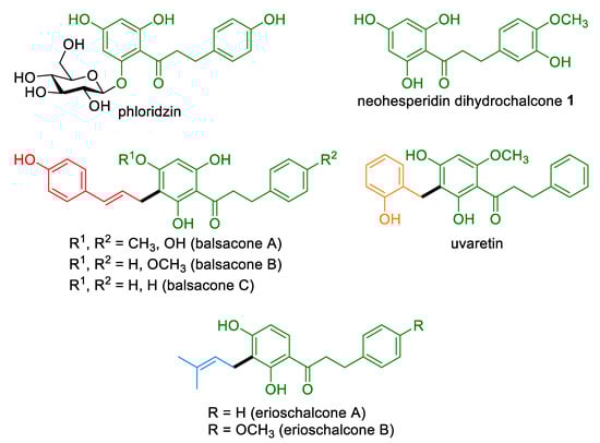 - Rivière, C. Chapter 7—Dihydrochalcones: Occurrence in the Plant Kingdom, Chemistry and Biological Activities. In Studies in Natural Products Chemistry; Rahman, A., Ed.; Elsevier: Amsterdam, The Netherlands, 2016; Volume 51, pp. 253–281. [Google Scholar] [CrossRef]