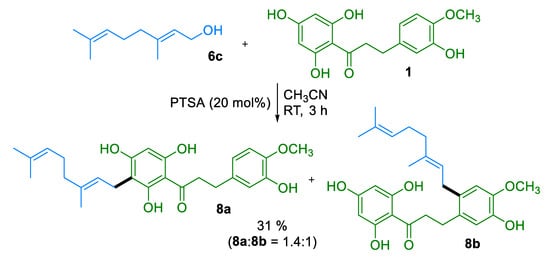 Finally, we envisioned the preparation of a C-prenylated derivative from DHC 1. The single synthesis of a prenylated DHC that we were able to retrieve was a chemoenzymatic transformation of phloretin involving dimethylallyltryptophan synthase that afforded a C-prenylated counterpart in a modest 14.5% yield []. On the other hand, several syntheses of various C-prenylated flavonoids and phloroglucinol derivatives have been reported. They mainly relied on the alkylation of acylphloroglucinol scaffolds using allylbromides [,], and only a few studies involved prenol (6a) or 2-methyl-3-buten-2-ol (6b) as the alkylating agent. A representative example was xanthohumol. In the total synthesis [] of this C-prenylated chalcone from hops (Humulus lupulus L.), prenol (6a) reacted with a protected acetophloroglucinol derivative under Mitsunobu conditions to provide an ether. A Claisen rearrangement then occurred upon heating to yield a C-prenylated intermediate. The chalcone scaffold was then constructed following a Claisen–Schmidt condensation with a protected aldehyde prior to a final deprotection. Overall, the total synthesis of xanthohumol required six steps from acetophloroglucinol with an 11% overall yield. Once again, an alternative method based on the direct prenylation of a natural DHC would be highly desirable in both terms of step- and atom-economy.