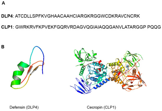 (A) Sequence of DLP4 (40-amino acid sequence, 4267 Da), [15] and CLP1 (46_amino acid sequence, 4840 Da) [16]. (B) Structural representation and molecular modeling of DLP4 (pdb code: 2nz3) and CLP1 (pdb code: 2npi). Molecular models were generated with PyMOL 2.4.1.