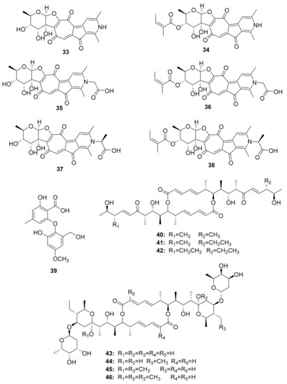 Further research on Streptomyces sp. M56 resulted in the identification of two new compounds with an unsaturated enone moiety, named efomycins K (40) and L (41), in addition to the well-known efomycin M (42), a potent and specific inhibitor of selectin [74,75,76]. Subsequently, five known and structurally related hemiketal derivatives—efomycin G (43) [77], elaiophylin (44) [78], 11-O-methylelaiophylin (45) [78], and 11,11′-O-dimethylelaiophylin (46)—were isolated [79,80].